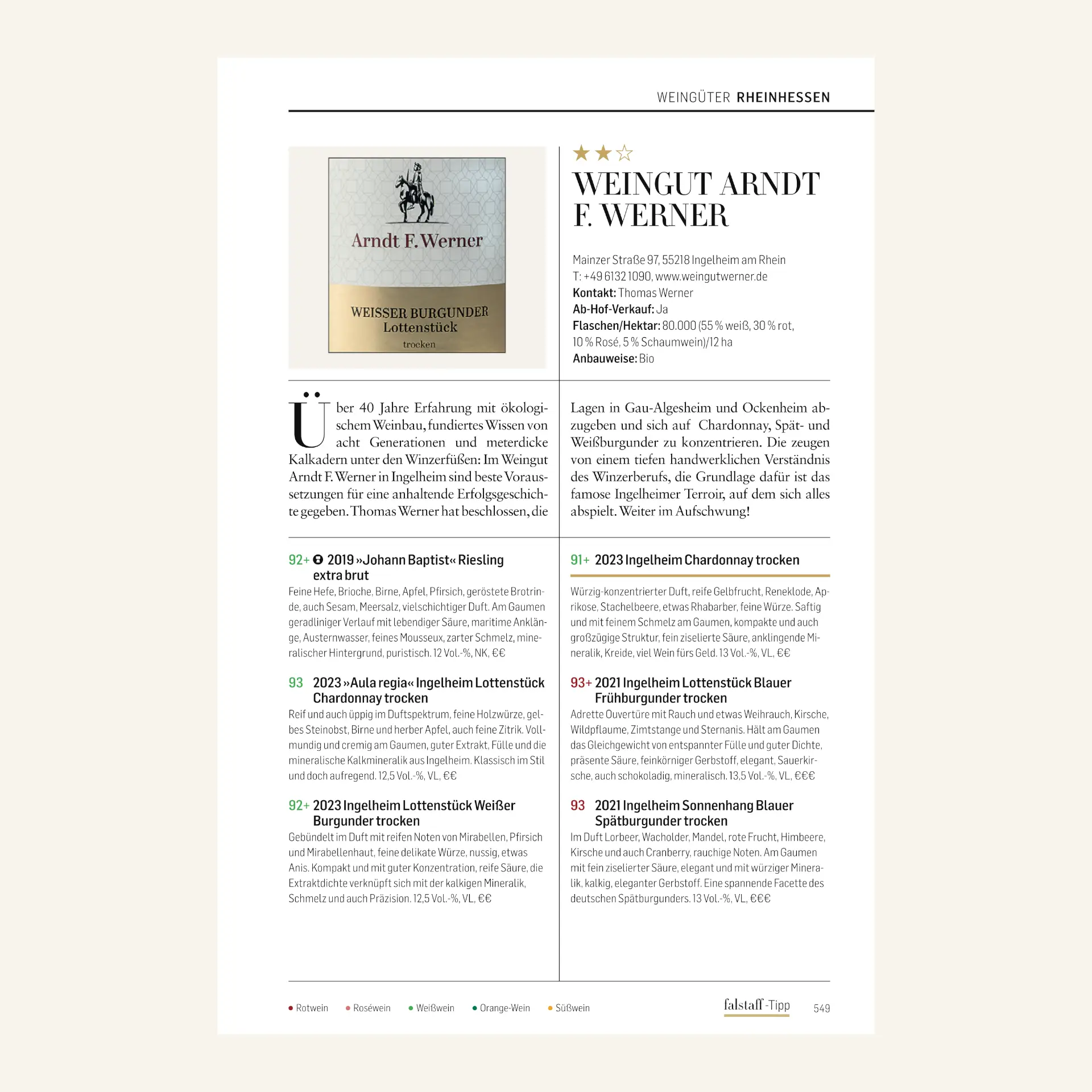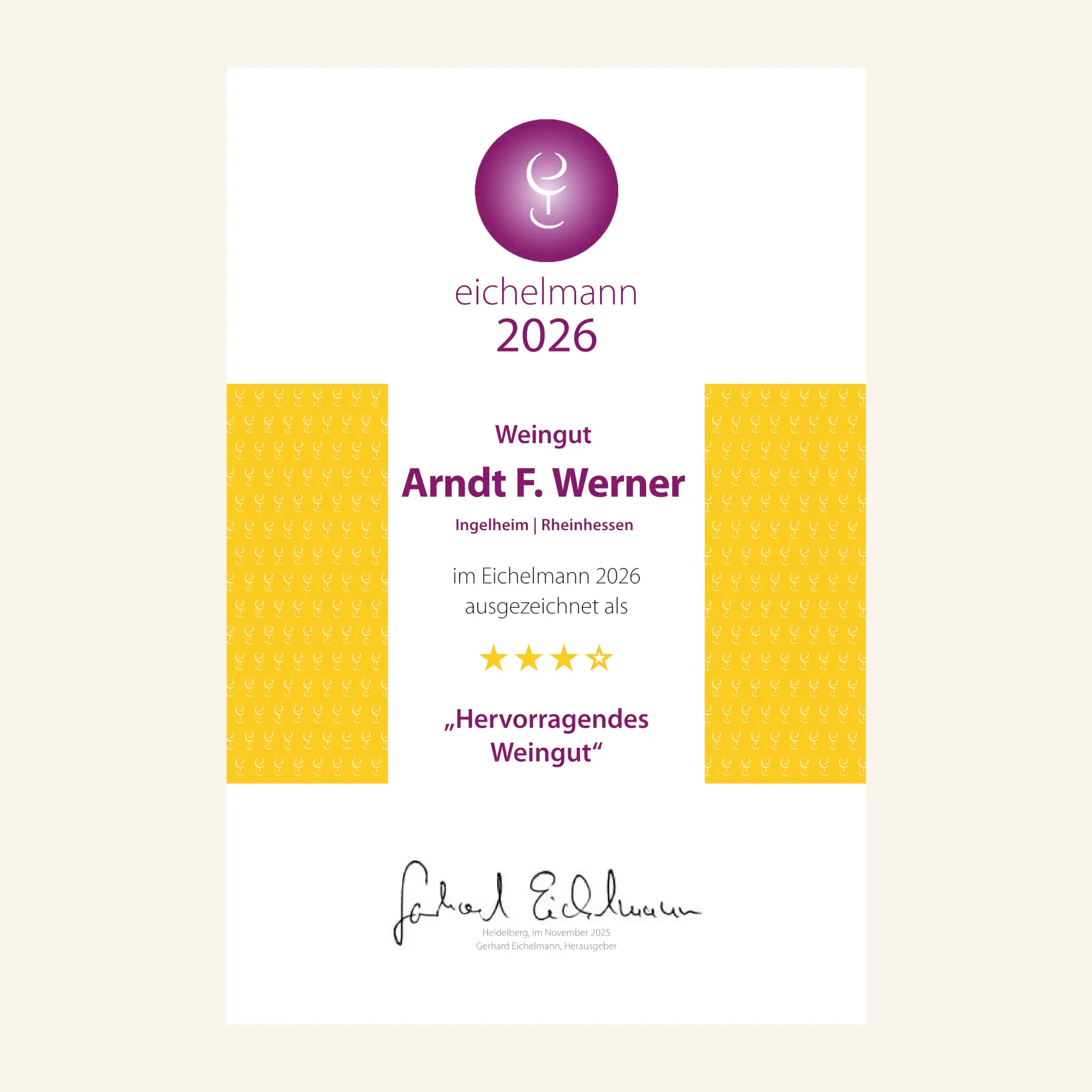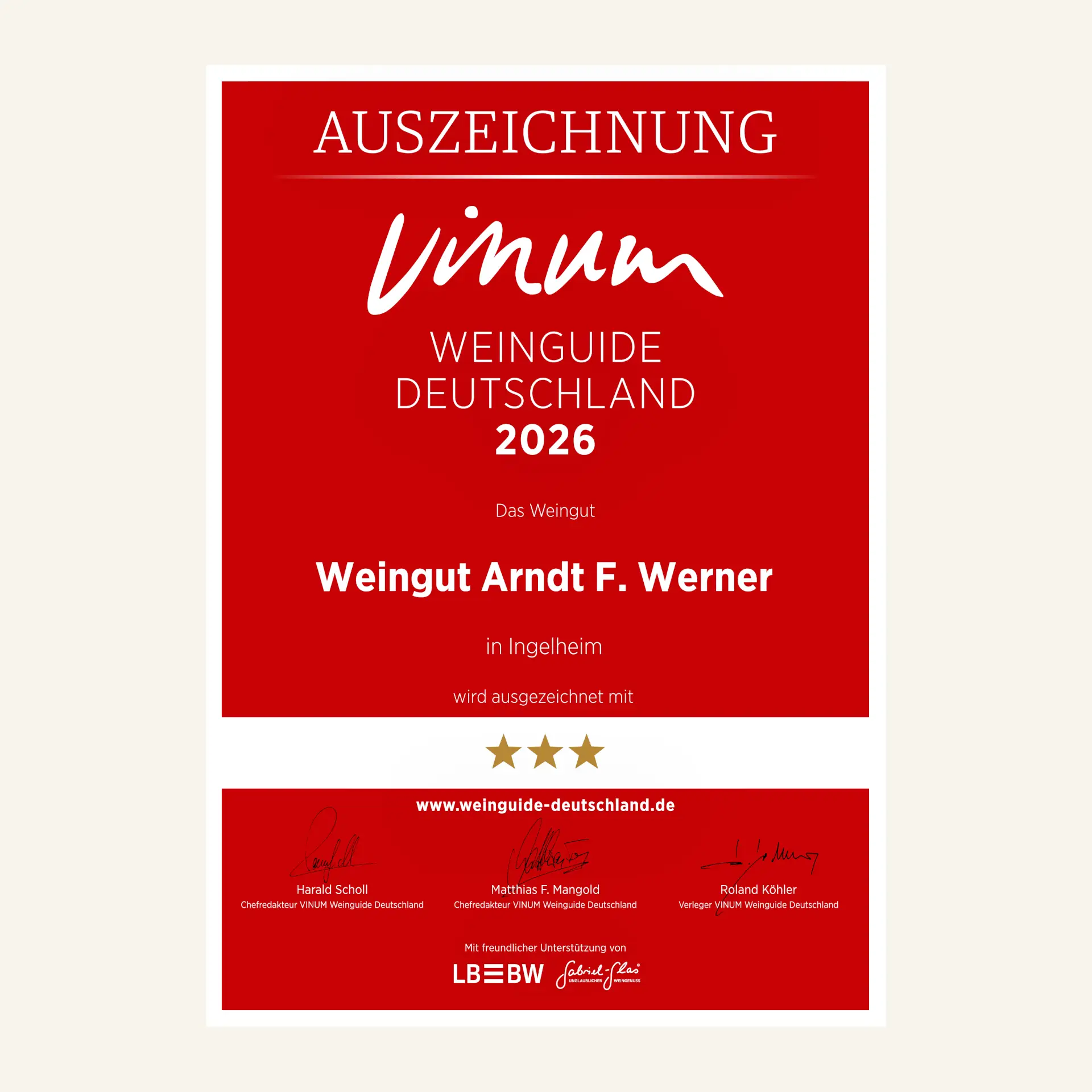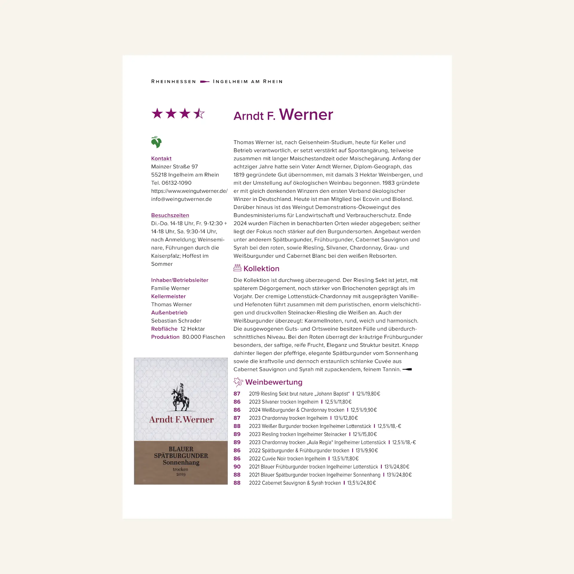 Über 40 Jahre Erfahrung mit ökologischem Weinbau, fundiertes Wissen von acht Generationen und meterdicke Kalkadern unter den Winzerfüßen: Im Weingut Arndt F. Werner in Ingelheim sind beste Voraussetzungen für eine anhaltende Erfolgsgeschichte gegeben. Thomas Werner hat beschlossen, die Lagen in Gau-Algesheim und Ockenheim abzugeben und sich auf Chardonnay, Spät- und Weißburgunder zu konzentrieren. Die zeugen von einem tiefen handwerklichen Verständnis des Winzerberufs, die Grundlage dafür ist das famose Ingelheimer Terroir, auf dem sich alles abspielt. Weiter im Aufschwung!